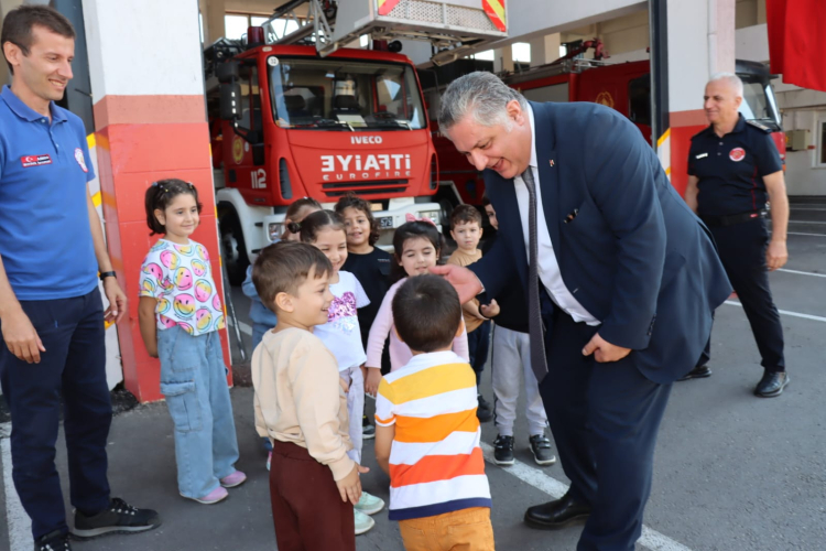 Ziyaretin ardından Başkan Gürel, İtfaiye Müdürlüğünü ziyaret eden çocuklarla bir araya gelerek onlarla sohbet etti.
