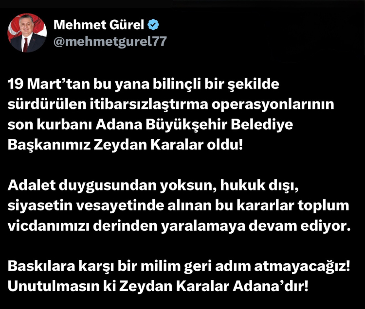 Başkan Gürel, bu kararın vicdanları derinden yaraladığını belirtirken sözlerinde şu ifadeleri kullandı, ‘’19 Mart’tan bu yana bilinçli bir şekilde sürdürülen itibarsızlaştırma operasyonlarının son kurbanı Adana Büyükşehir Belediye Başkanımız Zeydan Karalar oldu! Adalet duygusundan yoksun, hukuk dışı, siyasetin vesayetinde alınan bu kararlar toplum vicdanımızı derinden yaralamaya devam ediyor. Baskılara karşı bir milim geri adım atmayacağız! Unutulmasın ki Zeydan Karalar Adana’dır!’’