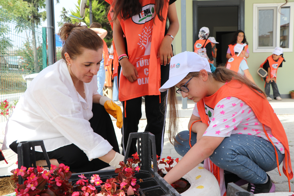 Öğrenciler atık merkezini ve kompost tesisini gezerek geri dönüşümle ilgili bilgiler almalarının ardından Çiftlikköy Belediye Başkanı Adil Yele’nin eşi Yeşim Yele eşliğinde lastiklerden oluşturulan saksılara yanlarında getirdikleri begonyaları dikerken renkli görüntüler sergiledi.