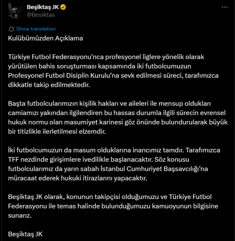 Beşiktaş JK, yaptığı açıklamada futbolcularının masumiyetine inandığını belirtti. Kulüp, süreçle ilgili TFF nezdinde girişimlere başlanacağını ve futbolcuların İstanbul Cumhuriyet Başsavcılığı’na başvurarak hukuki itirazlarını yapacaklarını duyurdu. Kulüpten yapılan açıklamada “Başta futbolcularımızın kişilik hakları ve aileleri ile mensup oldukları camiamızı yakından ilgilendiren bu hassas durum, masumiyet karinesi göz önünde bulundurularak büyük bir titizlikle ilerletilmelidir.” İfadeleri kullanıldı Beşiktaş JK, kamuoyunu bilgilendirerek TFF ile sürekli temas halinde olduklarını belirtti.