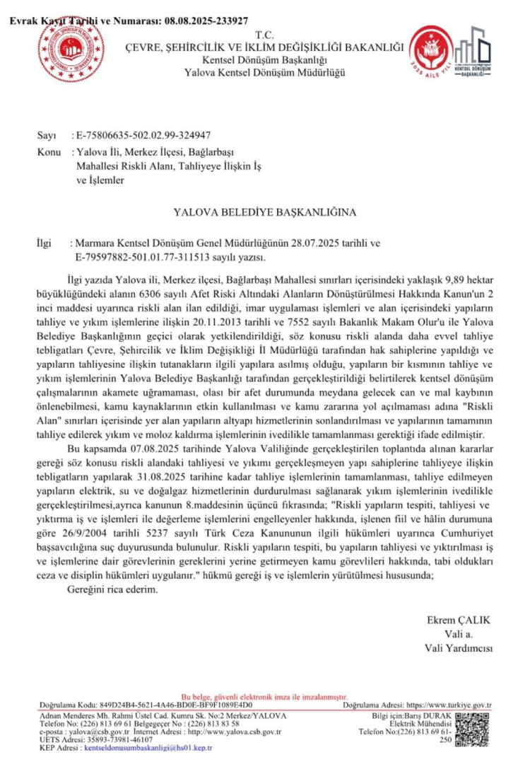Süreç, Çevre, Şehircilik ve İklim Değişikliği Bakanlığı Kentsel Dönüşüm Başkanlığı’nın 28 Temmuz 2025 tarihli yazısı ve Yalova Kentsel Dönüşüm İl Müdürlüğü’nün 8 Ağustos 2025 tarihli bildirimiyle resmiyet kazandı.