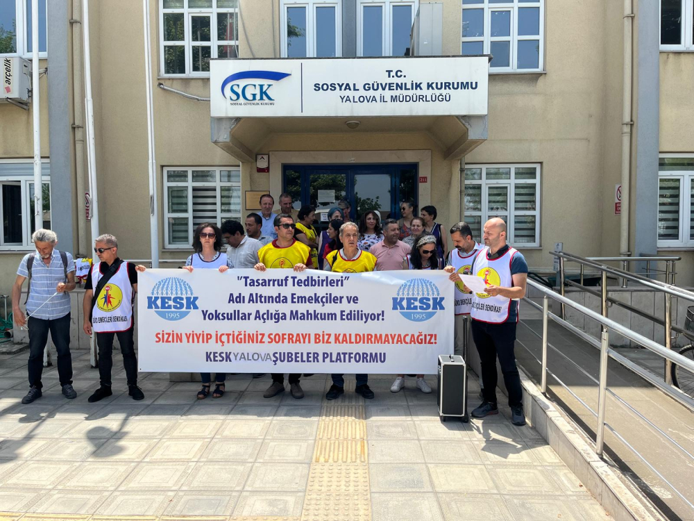 Büro Emekçileri Sendikası Yalova Temsilciliği ve KESK Şubeler Platformu üyeleriYalova SGK İl Müdürlüğü önünde seslerini yükselterek, "Tasarruf tedbirleri adı altında emekçiler ve yoksullar açlığa mahkûm ediliyor. Sizin yiyip içtiğiniz sofrayı biz kaldırmayacağız!” dedi.