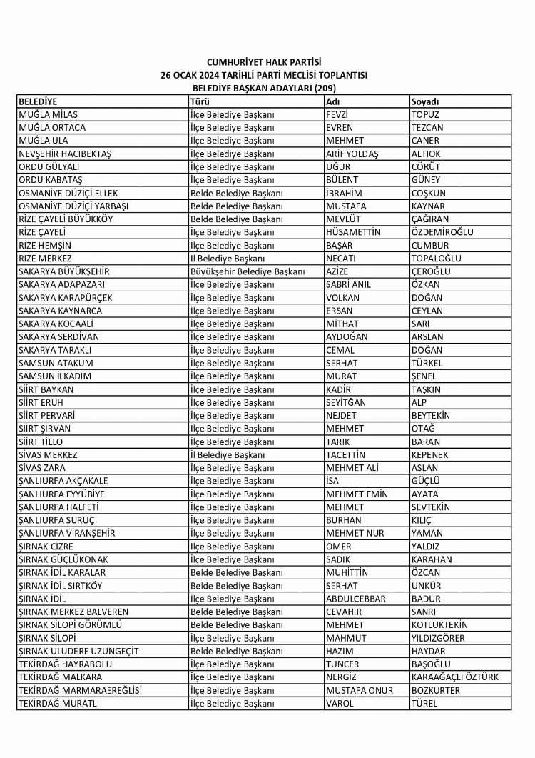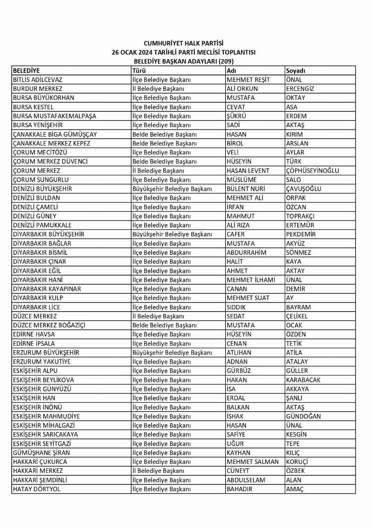 Cumhuriyet Halk Partisi yerel seçimler için ittifak arayışını sürdürürken seçmenlerin gözü il ve ilçelerde çıkacak adaylardaydı. Önce İYİ Parti ardından Memleket Partisi son olarak ise DEM Parti ile iş birliği için görüşen CHP’nin beklediği destek hiçbir partiden gelmeyince genel merkez son olarak 209 belediye için seçilen adaylarını duyurmaya karar verdi.