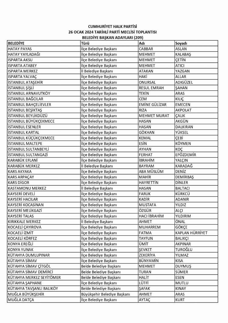 Yerel seçimlere 2 ay gibi kısa bir süre kala Cumhuriyet Halk Partisi henüz aday tanıtımlarını tamamlamış değil. Son olarak dün yapılan bir açıklama ile İstanbul ilçe adayları dahil 209 belediyenin daha adayları belli oldu.