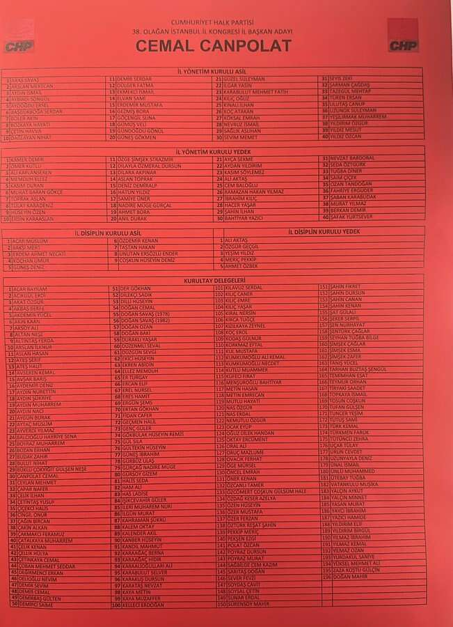 CHP İstanbul İl Başkanlığı seçimlerinde iki liste yarıştı. Özgür Çelik (beyaz liste), Cemal Canpolat (kırmızı liste) oldu.CHP İstanbul İl Başkan Adayı Cemal Canpolat’ın listesinde gezi direnişinin simgesi haline gelen Berkin Elvan’ın babası Sami Elvan ile Deniz Gezmiş’in kardeşi Bora Gezmiş’i yönetim kurulunu listelerinde yer verdi. Beyaz listede Kurultay delegesi yazılan Ekrem İmamoğlu Cemal Canpolat’ın listesinde kurultay delegesi yazılmadı. Cemal Canpolat, kendilerinin örgütten geldiğini söyleyerek hiçbir belediye başkanına listesinde yer vermedi.