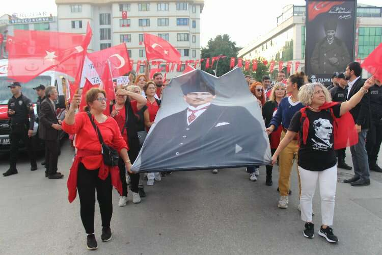 Yalova halkı bu kutlu gün için 29 Ekim Pazar günü saat 17.00’da, 15 Temmuz Demokrasi ve Cumhuriyet Meydanı’nda toplandı. Yürüyüşün başında CHP Yalova Milletvekili Tahsin Becan, CHP İl Başkanı Erdem Doğancı, CHP Merkez İlçe Başkanı Kemal Sürel, CHP Kadın Kolları Başkanı Meryem Ataç, CHP Merkez İlçe Gençlik Kolları Başkanı Cem Karadağ ve ilçe başkanları bulundu.