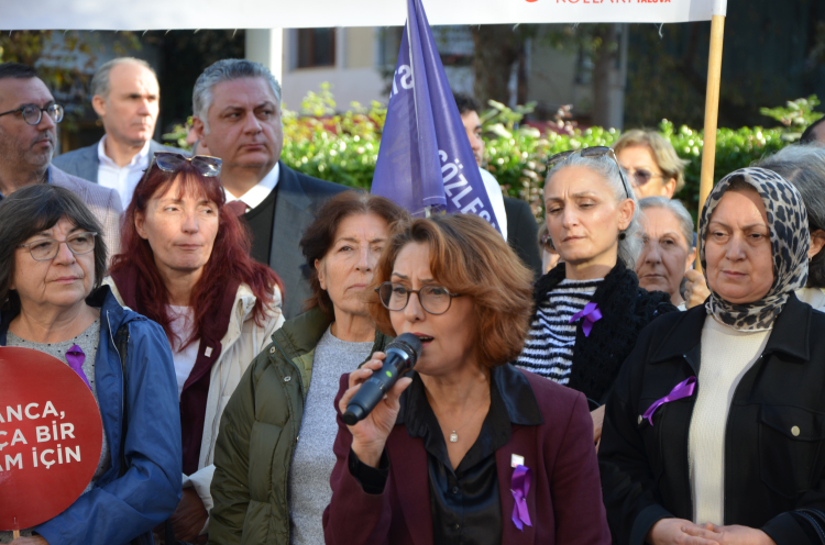 Meryem Ataç açıklamasında kadın cinayetlerine dikkat çekerek “Bugün burada sadece bir günü değil, bir dünya düzenine karşı kadınların yüzyıllardır süren isyanını konuşuyoruz. 25 Kasım, Mirabel Kardeşlerden bugüne uzanan o dev kadın mücadelesinin adıdır. Biz biliyoruz ki bu ülkenin karanlığına rağmen, kadınların dayanışması hâlâ en büyük ışık, en büyük cesarettir. OECD verilerine göre, kadına şiddette %38 ile OECD ülkeleri arasında birinci olan ülkemizde kadınlar sadece öldürülmüyor yok sayılıyor, susturuluyor, yalnız bırakılıyor. Tecavüzler örtbas ediliyor, cinayetlere intihar süsü veriliyor, failler korunuyor. Neden? Çünkü bu düzenin sahipleri kadınları hâlâ güçsüz, hâlâ itaatkâr, hâlâ kontrol edebilecekleri bir varlık sanıyor” sözlerini sarf etti.