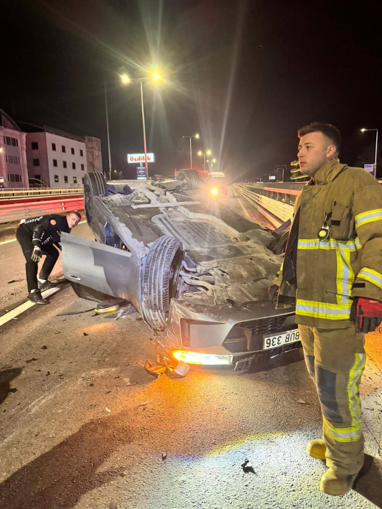 Savrulan otomobil takla atarak üst geçidin üzerinde ters döndü. Kazayı gören diğer sürücüler 112 Acil Çağrı Merkezine ihbarda bulundu.