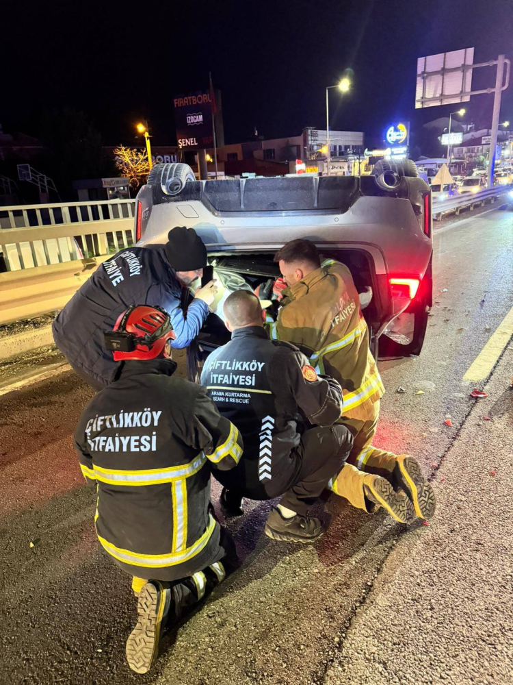 İhbar üzerine olay yerine çok sayıda sağlık, polis ve itfaiye ekibi sevk edildi. Çiftlikköy Belediyesi İtfaiye Müdürlüğü ekipleri ters dönen aracın içerisinde sıkışarak yaralanan sürücüyü kurtararak sağlık ekiplerine teslim etti.