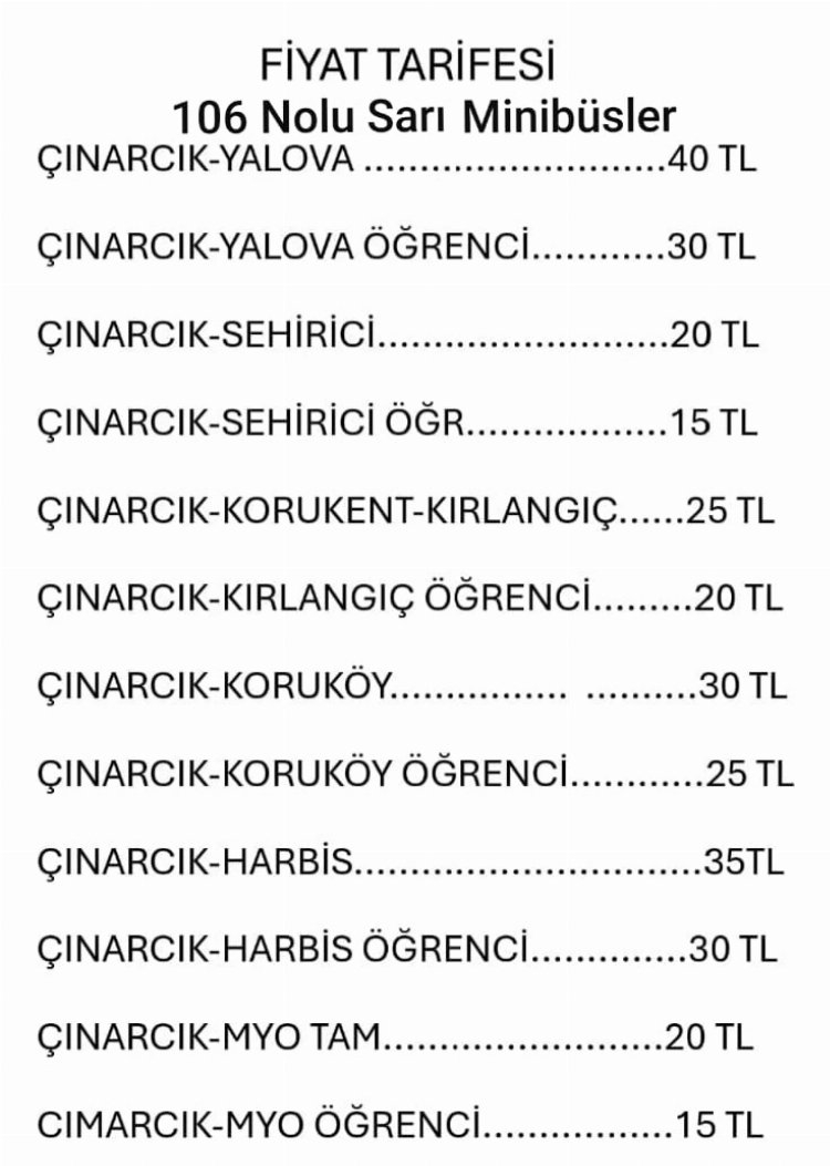 20 Mayıs Pazartesi gününden itibaren 106 numaralı sarı minibüslerin Yalova ve Çınarcık arası tam ücreti 40 TL olurken, öğrenci ücreti 30 TL oldu. Şehir içi indi bindi ise 20 TL’ye çıktı. Çınarcık Belediyesi otobüslerinin Yalova-Çınarcık arası tam ücreti 35 TL, öğrenci ücreti 25 TL, şehir içi indi bindi ise 20 TL oldu.
