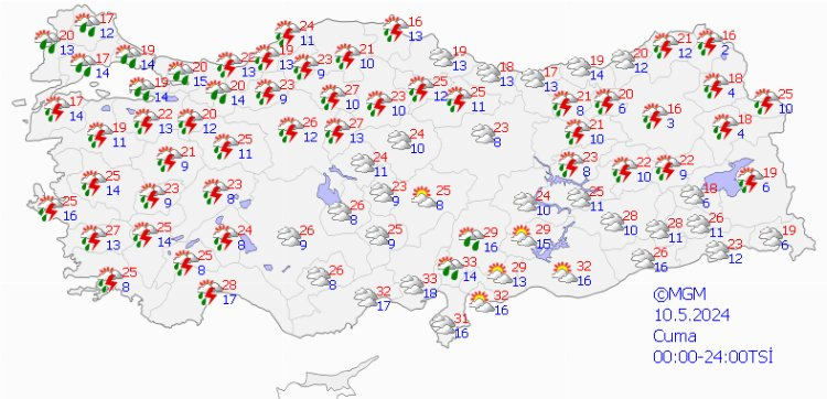 Öte yandan, Meteoroloji Genel Müdürlüğü tarafından yapılan son değerlendirmelere göre: Yurt genelinin parçalı ve yer yer çok bulutlu, Marmara'nın güney ve doğusu, Batı Karadeniz ile Ankara'nın kuzey ve batısı, Edirne, Kırklareli, Manisa, Kütahya, Eskişehir, Çankırı, Çorum, Kars, Iğdır, Van ve Hakkari çevrelerinin yerel sağanak ve yer yer gök gürültülü sağanak yağışlı geçeceği tahmin ediliyor.