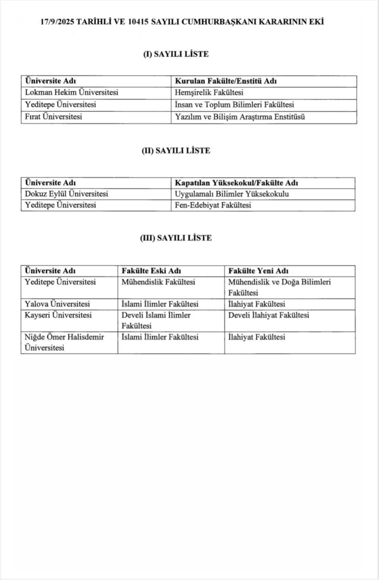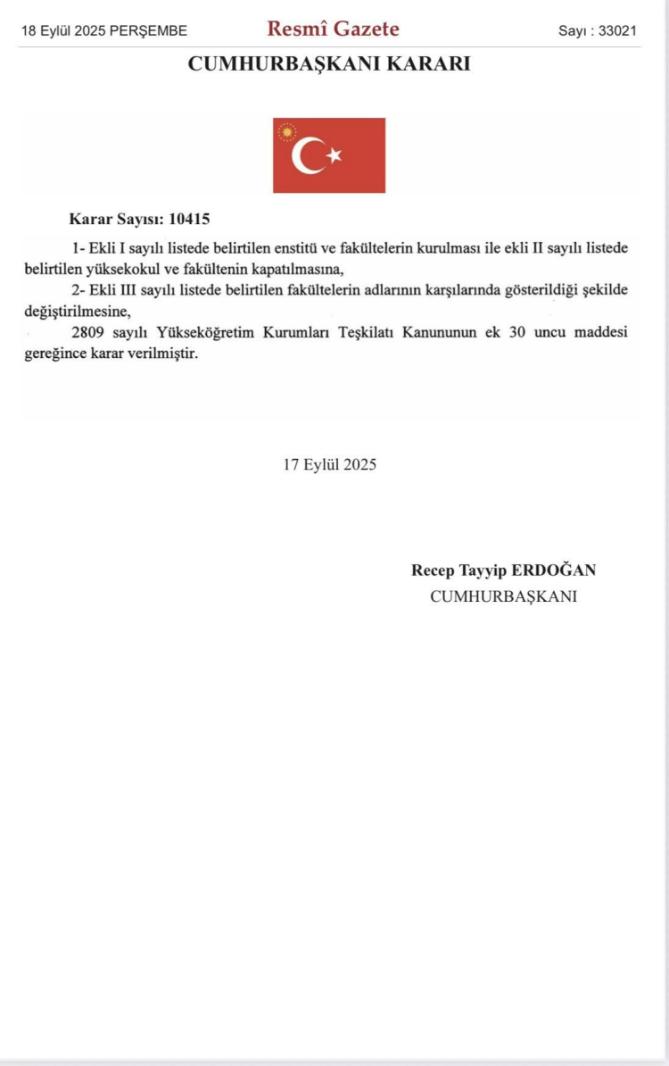 Aynı kararla birlikte bazı yüksekokullar kapatılırken, bazı fakültelerin isimleri de değiştirildi. Cumhurbaşkanı Recep Tayyip Erdoğan’ın imzasıyla Resmi Gazete’de yayımlanan karara göre, çeşitli üniversitelerde yeni akademik birimler kuruldu.