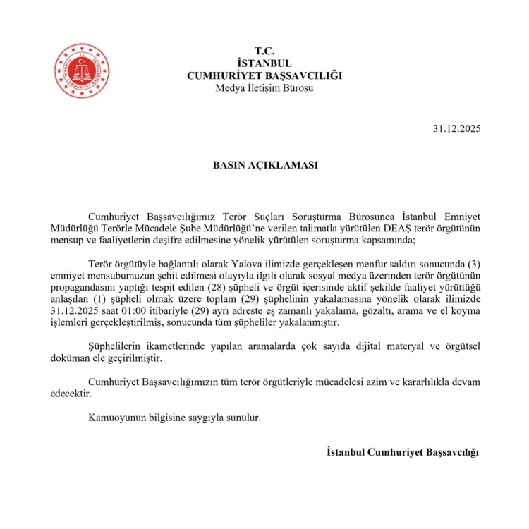 İstanbul Cumhuriyet Başsavcılığı, Yalova’da 3 polis memurunun şehit edildiği saldırının ardından sosyal medyada terör örgütü DEAŞ lehine propaganda yapanlara yönelik geniş çaplı bir operasyon başlattı. İstanbul genelinde düzenlenen eş zamanlı baskınlarda 29 şüpheli gözaltına alındı.