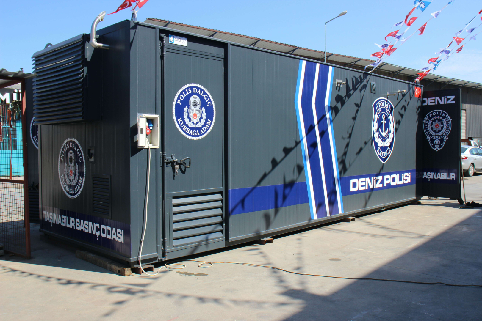 Savunma Sanayii Başkanlığı tarafından Emniyet Genel Müdürlüğü Deniz Polisi için yapılan Türkiye'nin ilk taşınabilir basınç odası kabini tamamlandı. Çanakkale Deniz Polisi Eğitim Merkezi Müdürlüğü'ne gönderilecek kabinin Yalova’daki testlerin ardından tırla yarın yola çıkması bekleniyor. Çanakkale Deniz Polisi Eğitim Merkezi’nin ihtiyaçlarına uygun şekilde tasarlanan taşınabilir basınç odasının kabul testlerinin başarıyla yapıldığını ifade eden üretici firmanın Yönetim Kurulu Başkan Vekili Yiğithan Demirdik, imalatını yaptıkları basınç odasını teslim etmenin gururunu yaşadıklarını söyledi.