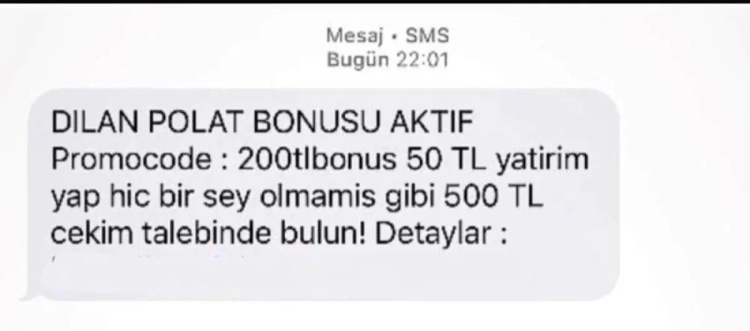 Krizi fırsata çeviren sanal bahis sitesi dolandırıcıları, vatandaşlara “Dilan Polat bonusu” başlıklı SMS’ler atmaya başladı.