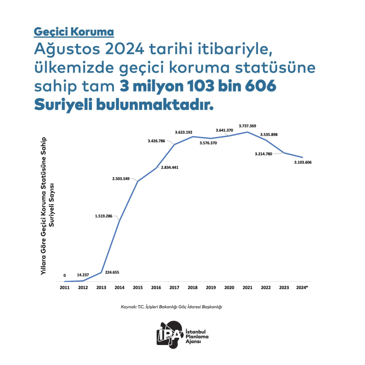 2024 Ağustos ayı itibariyle, Türkiye’de geçici koruma statüsüne sahip tam 3 milyon 103 bin 606 Suriyeli bulunuyor. İçişleri Bakanlığı Göç İdaresi Başkanlığı verilerine göre, Türkiye’de 2020 yılında 3 milyon 641 bin 370, 2021 yılında 3 milyon 535 bin 898, 2022 yılında 3 milyon 214 bin 780, 2024 yılı 1 Ağustos itibariyle ise 3 milyon 103 bin 606 geçici koruma statüsüne sahip Suriyeli bulunduğu bilgisi yer aldı.