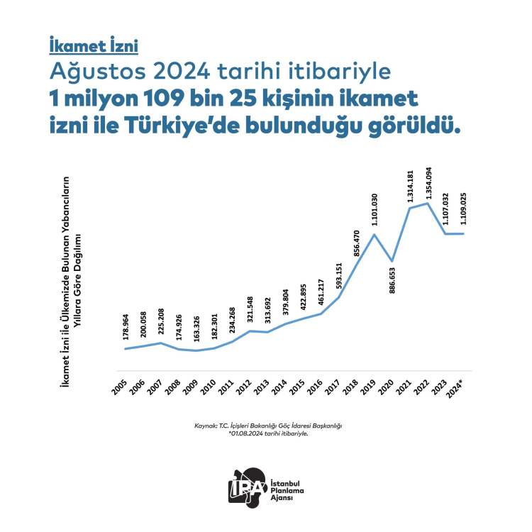 Ağustos 2024 tarihi itibariyle 1 milyon 109 bin 25 kişinin ikamet izni ile Türkiye’de yaşadığı görüldü. İkamet izni ile Türkiye’de bulunan yabancıların illere göre dağılımında yine İstanbul 540 bin 969 kişi ile birinci sırada yer aldı. İstanbul’u 127 bin 683 kişi ile tatilin gözdesi Antalya takip etti. Ağustos 2024 itibariyle, ikamet izni ile Türkiye’de bulunan yabancılar arasında en fazla sayıya sahip olan uyruğun 112 bin 43 ile Türkmenistan oldu. Bu grubu, 94 bin 44 kişi ile Rusya uyruklu yabancılar takip etti.