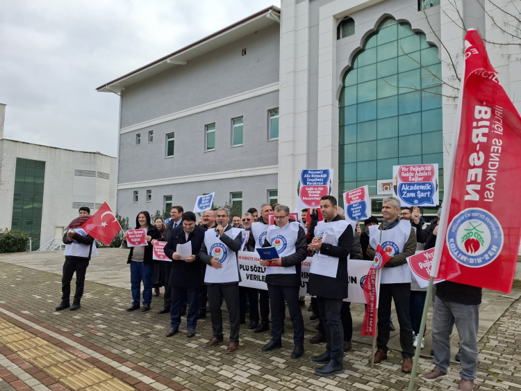 Yalova Eğitim Bir-Sen, Yalova Üniversitesi kampüsünde yaptığı basın açıklamasıyla akademik ve idari personelin sorunlarını dile getirdi.