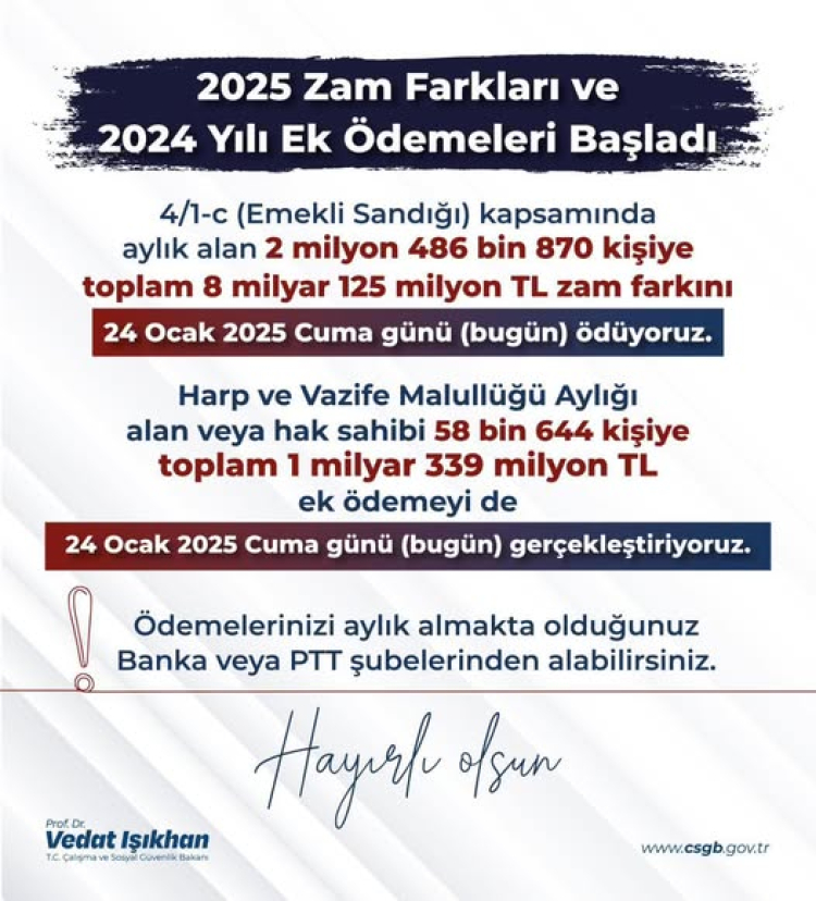 Bakan Işıkhan sosyal medya hesaplarından yaptığı açıklamada, “Emekli Sandığı kapsamında aylık alanların 2025 yılı zam farkları ile Harp ve Vazife Malullüğü aylığı alan vatandaşlarımızın 2024 yılı ek ödemelerini bugün hesaplarına yatırıyoruz. Vatandaşlarımıza ve kıymetli ailelerine hayırlı olmasını diliyorum.” ifadelerine yer verdi.