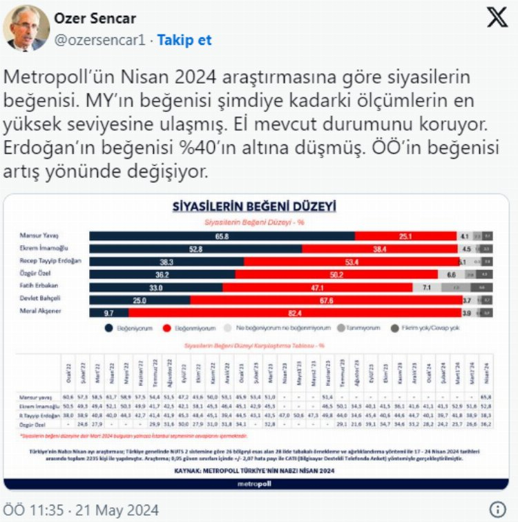 Anketi gerçekleştiren MetroPOLL Araştırma Şirketinin Kurucusu Özer Sencar, anket sonuçlarını sosyal medya hesabı üzerinden paylaşarak şu ifadeleri kullandı: "Mansur Yavaş'ın beğenisi şimdiye kadarki ölçümlerin en yüksek seviyesine ulaşmış. Ekrem İmamoğlu mevcut durumunu koruyor. Erdoğan'ın beğenisi yüzde 40'ın altına düşmüş. Özgür Özel'in beğenisi artış yönünde değişiyor."