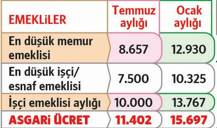 Öte yandan toplu sözleşme zammından faydalanmayan işçi, esnaf ve çiftçi emeklilerine ise sadece geçmiş 6 aylık enflasyon kadar zam yapılacak. Aralık ayında tüketici fiyat endeksi (TÜFE) yüzde 3 gerçekleşirse, yılın başında söz konusu emeklilere yüzde 37.67 oranında zam yapılacak. En düşük 7 bin 500 lira olan emekli aylığı da ilave zam yapılması halinde 10 bin 325 lira bandında kalacak.