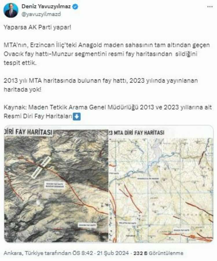 Madenin fay hattı üzerinde kurulduğuna ilişkin sosyal medya üzerinden açıklama yapan CHP Genel Başkan Yardımcısı Deniz Yavuzyılmaz, bir belge paylaşarak Maden Tetkik Arama'nın 2013 yılında hazırladığı raporunda görünen fay hattının 2023'teki raporda silindiğini iddia etti.