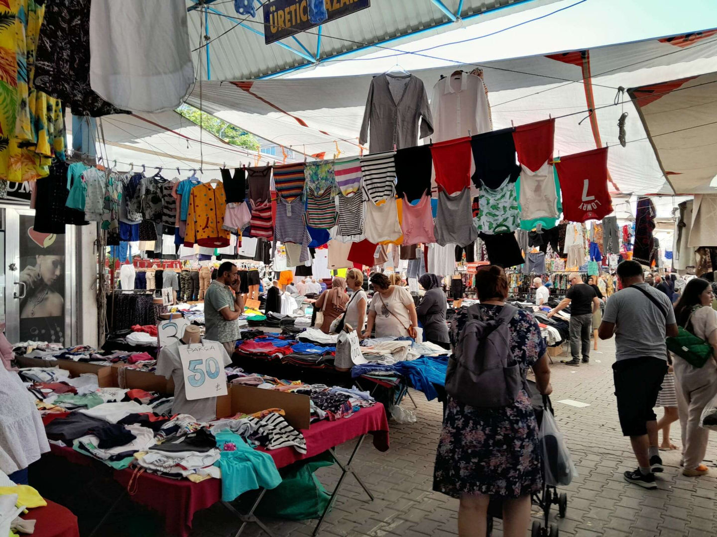 Sosyete Pazarı’nda erkek kadın tişörtleri 150-200 TL, kadın elbiseleri 300-350 TL olmak üzere tunik 250 TL, bol-dar paça 200 TL, uzun elbise 350-400 TL, çantalar 60-150 TL, gömlekler 250-300 TL, pantolonlar 150-200 TL’den satışa sunuluyor.