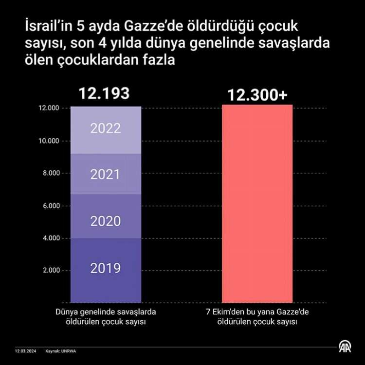Grafikte, son 4 yıldaki savaşlarda öldürülen çocuk sayısı 12 bin 193 olarak görünürken, Gazze'de son 5 ayda öldürüldüğü bildirilen çocuk sayısının 12 bin 300'ün üzerinde olduğu aktarıldı.