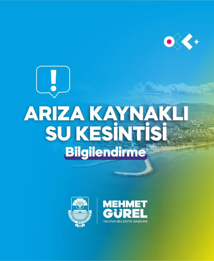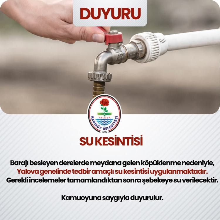 Duyuruda "Yeşil Körfez Su Birliği Arıtma Tesisi’nde meydana gelen teknik arıza nedeniyle bugün (30 Ocak 2025 Perşembe) Yalova genelinde su kesintisi yaşanacaktır. Arızanın giderilmesiyle beraber şebekeye su verilecektir. Anlayışınız için teşekkür eder, verdiğimiz rahatsızlıktan dolayı özür dileriz" ifadeleri kullanıldı.