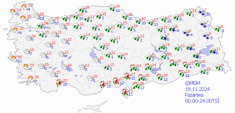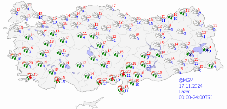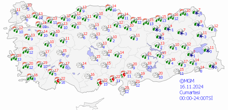 Hava sıcaklıklarının 16 Kasım Cumartesi günü Akdeniz kıyı kesimleri dışında kalan yerlerde 2 ila 4 derece azalması, Akdeniz kıyılarında önemli bir değişiklik olmaması bekleniyor.
