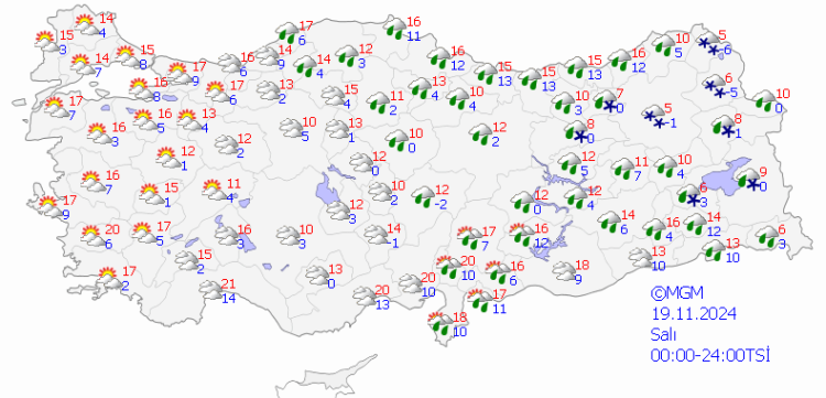 Meteoroloji tarafından yapılan son hava tahminlerine göre; ülkemizde havanın parçalı ve çok bulutlu, Marmara bölgesinin geneli, Ege'nin kuzey ve batı, İç Anadolu'nun kuzey ve doğu, Batı Akdeniz'in kıyı, Doğu Akdeniz'in İskenderun Körfezi ve Toroslar kesimleri ile (Çorum hariç) Karadeniz ve (Şırnak hariç) Doğu Anadolu Bölgelerinin yağışlı geçeceği tahmin ediliyor.