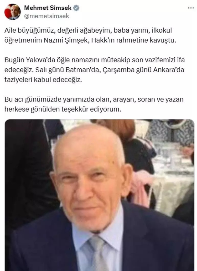 Ağabeyi Nazmi Şimşek’in vefatı üzerine sosyal medya hesabından paylaşımda bulunan Hazine ve Maliye Bakanı Mehmet Şimşek, Aile büyüğümüz, değerli ağabeyim, baba yarım, ilkokul öğretmenim Nazmi Şimşek, Hakk’ın rahmetine kavuştu. Bugün Yalova’da öğle namazını müteakip son vazifemizi ifa edeceğiz. Salı günü Batman’da, Çarşamba günü Ankara’da taziyeleri kabul edeceğiz. Bu acı günümüzde yanımızda olan, arayan, soran ve yazan herkese gönülden teşekkür ediyorum” sözlerine yer verdi.