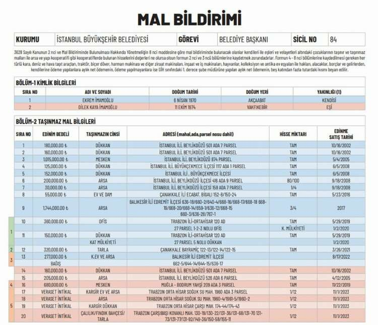 Bu konuların üzerine mevcut İstanbul Büyükşehir Belediye Başkanı Ekrem İmamoğlu kendisinin ve eşi Dilek İmamoğlu’nun üzerine kayıtlı tüm taşınır taşınmaz malların bildiriminde bulundu.