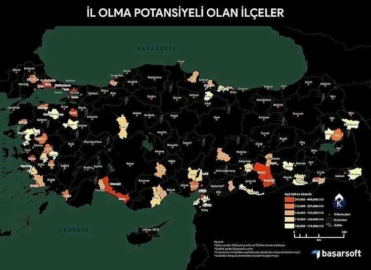 Türkiye’de birçok yönüyle il olma potansiyeli taşıyan birden fazla ilçe mevcut ve bu ilçeler de il olmak için talepte bulunuyor. İl olmak için başlıca şartları sağlayan ilçeler il olabilmek için sıraya girmiş durumda. Türkiye’deki birçok ilin nüfusundan daha fazla nüfusa sahip olan ilçeler mevcut.