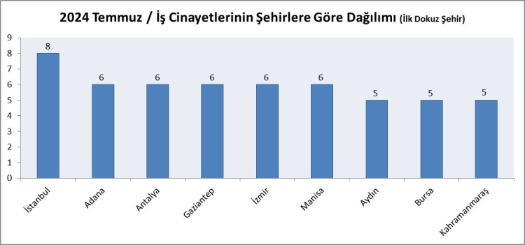 İSİG tarafından yapılan bu önemli açıklamada, ‘’Temmuz ayında Türkiye’nin 57 şehrinde ve yurtdışında bir ülkede (kısa vadeli çalışmak için gidilen veya Türkiye menşeili şirketlerde çalışan) iş cinayeti gerçekleştiğini tespit ettik: 8 ölüm İstanbul’da; 6’şar ölüm Adana, Antalya, Gaziantep, İzmir ve Manisa’da; 5’er ölüm Aydın, Bursa ve Kahramanmaraş’ta; 4’er ölüm Denizli, Samsun ve Şırnak’ta; 3’er ölüm Ankara, Bingöl, Çankırı, Edirne, Erzurum, Kayseri, Konya, Muğla, Rize, Şanlıurfa, Tekirdağ ve Kuzey Kıbrıs’ta; 2’şer ölüm Adıyaman, Burdur, Çorum, Kocaeli, Mersin, Ordu, Uşak, Yozgat ve Zonguldak’ta; 1’er ölüm Afyon, Amasya, Artvin, Batman, Bayburt, Bilecik, Bolu, Çanakkale, Elazığ, Eskişehir, Giresun, Hakkari, Hatay, Isparta, Karabük, Kars, Kırklareli, Mardin, Muş, Osmaniye, Sakarya, Siirt, Sinop, Sivas ve Yalova’da meydana geldi’’ ifadelerine yer verildi.