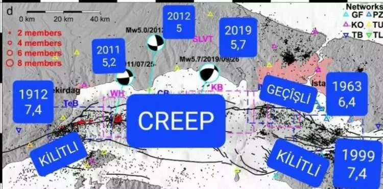 * Kuzey Marmara Fayı tıpkı San Andreas Fayında olduğu gibi iki büyük depremin fay segmentleri arasında sürünüp büyük deprem enerjisi biriktiremeden kısa aralıklarla orta büyüklükte depremler üretir (2011-2019 arası 5-5,7 arası üç deprem.)