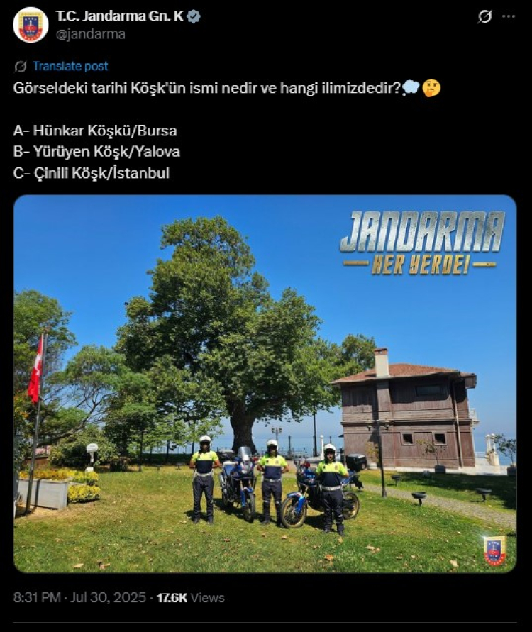Jandarma Genel Komutanlığı, X sosyal medya hesabından Yalova’nın simge yapılarından biri olan Yürüyen Köşk’ün fotoğrafını paylaştı. Görselin altına da ‘Görseldeki tarihi Köşk'ün ismi nedir ve hangi ilimizdedir?” sorusunu ekledi. Sosyal medya kullanıcıları paylaşıma yoğun ilgi gösterdi.