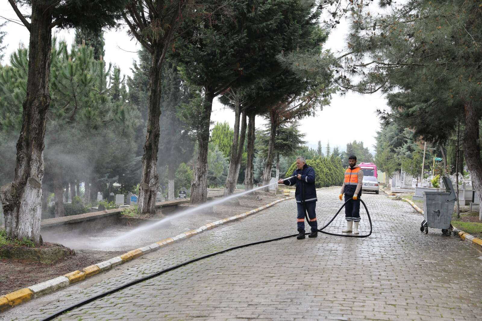 Mezarlıklarda çalışma yürüten ekipler; basınçlı su makinesi ile ara yolları, tazyikli su ile ana yolları temizledi. Ayrıca mezar kenarlarında ve yollarda biriken otların da temizliği büyük bir özenle gerçekleştirildi.