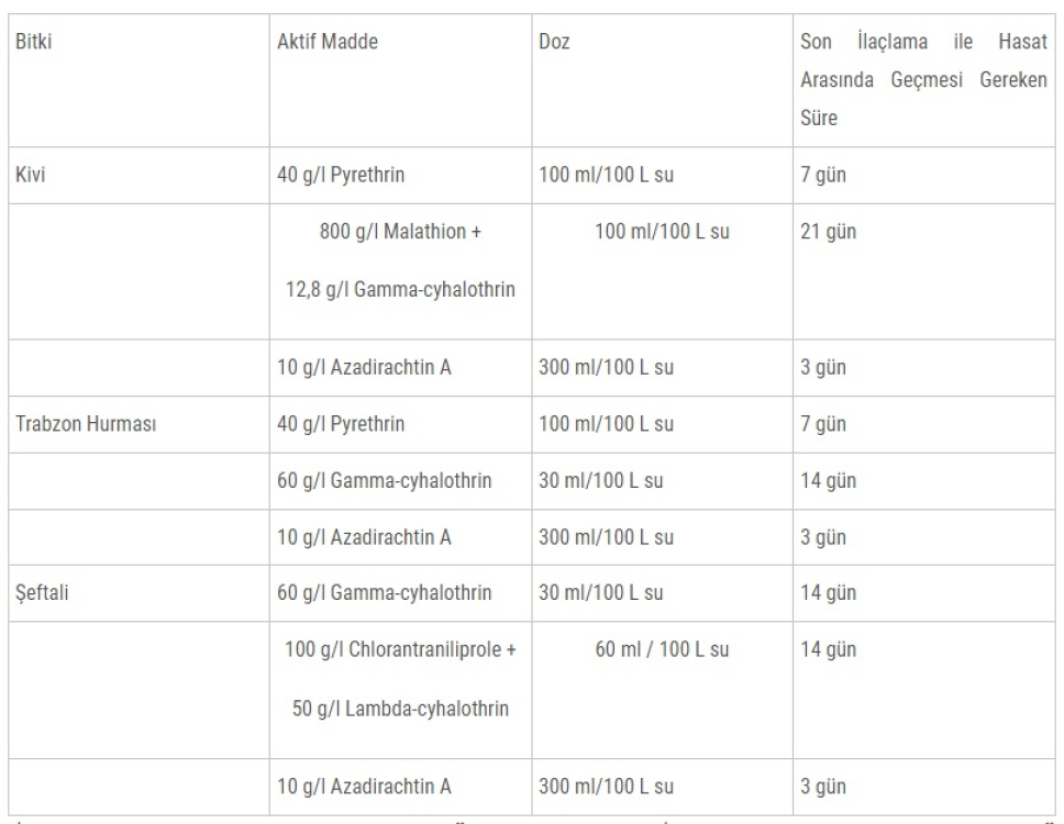 Sadece bitkilerden beslendiği için çiftçilerin baş belası haline gelen böceğe karşı kivi, şeftali ve Trabzon hurması üreten çiftçilere ilaçlama zamanının geldiğini bildiren İl Tarım ve Orman Müdürlüğü, kullanılacak etken madde ve dozlar hakkında da bilgi verdi. İlaçlamalar, bahçe kontrolleri yapıldıktan sonra nimf ve ergin kahverengi kokarca zararlısı tespit edilen bahçeler için Tarım ve Orman Bakanlığı tarafından verilen geçici tavsiye kararına istinaden yapılacak. Kivi ve Trabzon Hurması için 15 Haziran-15 Ekim 2024 tarihleri arasında, Şeftali için ise 15 Mayıs-15 Eylül 2024 tarihleri arasında bakanlık tarafından uygun görülen etken maddeleri içeren Bitki Koruma Ürünleri ile verilen dozajda ilaçlama yapılacak.