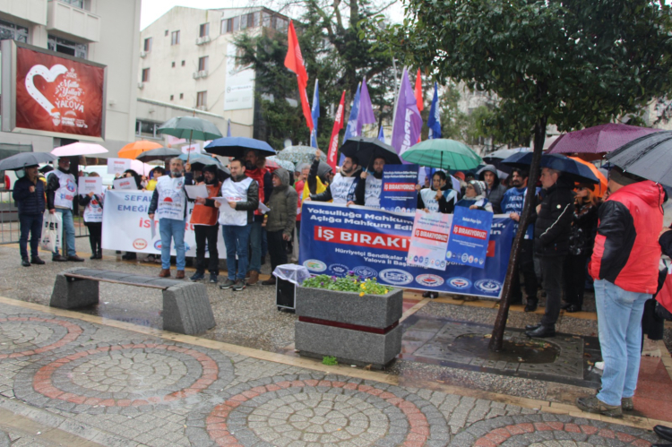 Yalova’da Cevdet Aydın Parkı’nda düzenlenen basın açıklamasına farklı sendikaların temsilcileri katıldı. Sendika temsilcileri tarafından okunan basın açıklamasında “Bugün, emeğimizin değersizleştirilmesine, yaşam koşullarımızın ağırlaştırılmasına, yoksullaştırılmamıza ve insanca yaşam hakkımızın hiçe sayılmasına karşı ülkemizin her köşesinde alanlardayız. Her geçen gün etkisini artıran ekonomik kriz, milyonların yaşamını daha da zorlaştırıyor. Alım gücümüz düşerken, en temel ihtiyaçlarımızı bile karşılamakta zorlanıyoruz. TÜİK tarafından açıklanan enflasyon rakamları gerçeği yansıtmıyor; maaşlarımız hızla eriyor ve hızla yoksullaşıyoruz” ifadeleri kullanıldı.