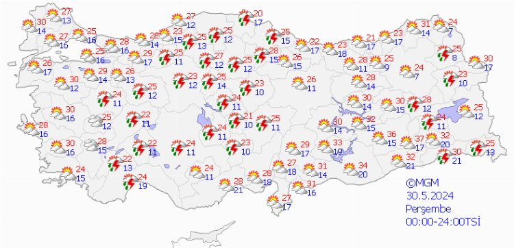 Meteoroloji Genel Müdürlüğü tarafından yapılan son değerlendirmelere göre bugün yurt genelinin parçalı yer yer çok bulutlu, Trakya Kesimi, Batı Akdeniz'in iç kesimleri ile Toroslar Mevkii, İç Anadolu (Eskişehir dışında), Orta Karadeniz, Kastamonu, Artvin, Ardahan, Kars ve Hakkari çevreleri ile Rize ve Trabzon'un iç kesimlerinin yerel sağanak ve gök gürültülü sağanak yağışlı geçeceği tahmin ediliyor.