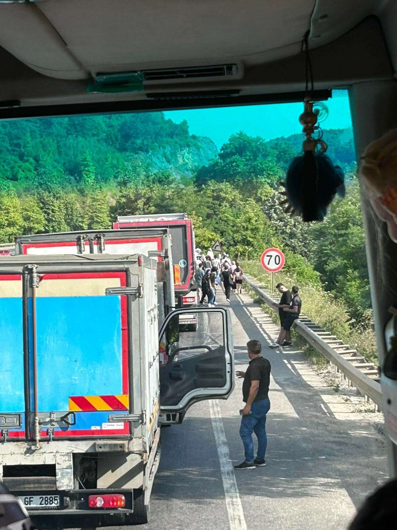 Orhangazi-Yalova Karayolu Soğucak Kavşağı yakınlarında kaza yapan kamyonun yolu kapatması sebebiyle Kamu Personel Seçme Sınavı'na (KPSS) girecek adaylar, araçlardan inip yürüyerek yollarına devam etti.