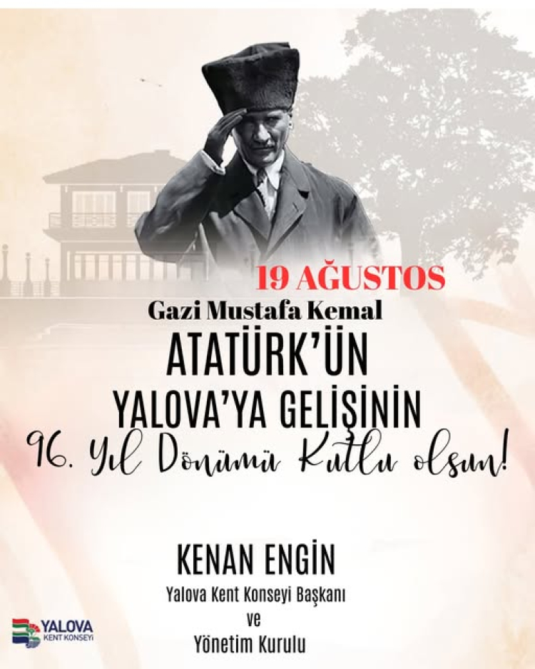 Yalova Kent Konseyi Başkanı Kenan Engin, Gazi Mustafa Kemal Atatürk’ün Yalova’ya gelişinin 96. yıl dönümü nedeniyle mesaj yayımladı.