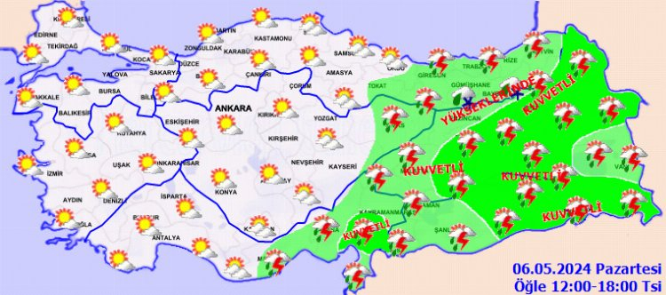 Yağışların; Hatay, Osmaniye, Malatya, Elazığ, Tunceli, Erzurum, Kars, Ardahan, Ağrı, Bingöl, Muş, Bitlis, Diyarbakır, Mardin, Batman, Siirt, Şırnak, Hakkâri ve Van’ın güneyinde yerel olarak kuvvetli olması bekleniyor.