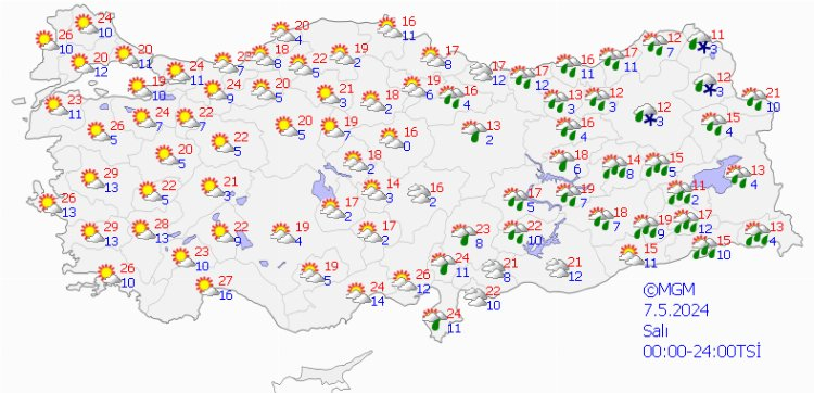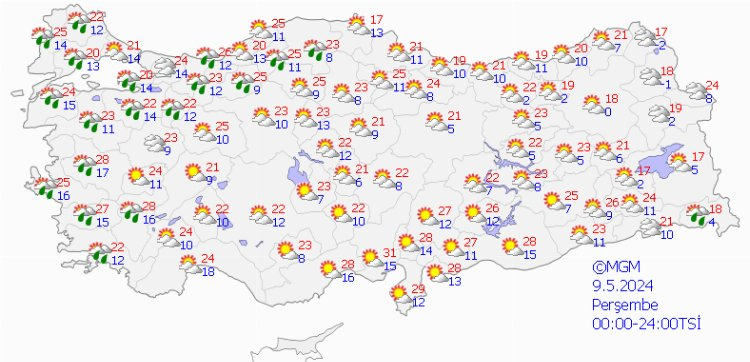 Meteoroloji'nin son değerlendirmelerine göre; yurt genelinin parçalı ve çok bulutlu, Marmara'nın kuzey ve doğusu, Güney Ege kıyıları, Akdeniz, İç Anadolu (Çankırı hariç), Doğu Karadeniz, Doğu ve Güneydoğu Anadolu ile Kütahya, Afyonkarahisar, Bolu, Düzce, Zonguldak, Tokat ve Ordu çevrelerinin sağanak ve gök gürültülü sağanak yağışlı geçeceği öngörülüyor.