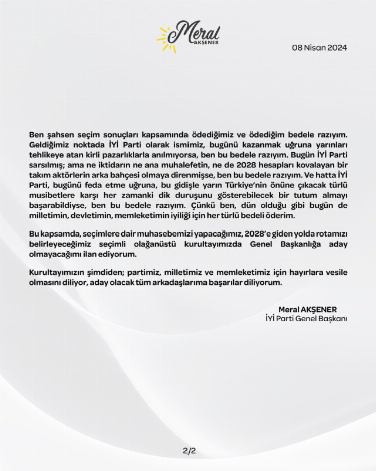 Akşener, "Seçim sonuçları kapsamında ödediğimiz ve ödediğim bedele razıyım. Geldiğimiz noktada İYİ Parti olarak ismimiz, bugünü kazanmak uğruna yarınları tehlikeye atan kirli pazarlıklarla anılmıyorsa, ben bu bedele razıyım. Bugün İYİ Parti sarsılmış; ama ne iktidarın ne ana muhalefetin, ne de 2028 hesapları kovalayan bir takım aktörlerin arka bahçesi olmaya direnmişse, ben bu bedele razıyım. Ve hatta İYİ Parti, bugünü feda etme uğruna, bu gidişle yarın Türkiye'nin önüne çıkacak türlü musibetlere karşı her zamanki dik duruşunu gösterebilecek bir tutum almayı başarabildiyse, ben bu bedele razıyım. Çünkü ben, dün olduğu gibi bugün de milletimin, devletimin, memleketimin iyiliği için her türlü bedeli öderim.