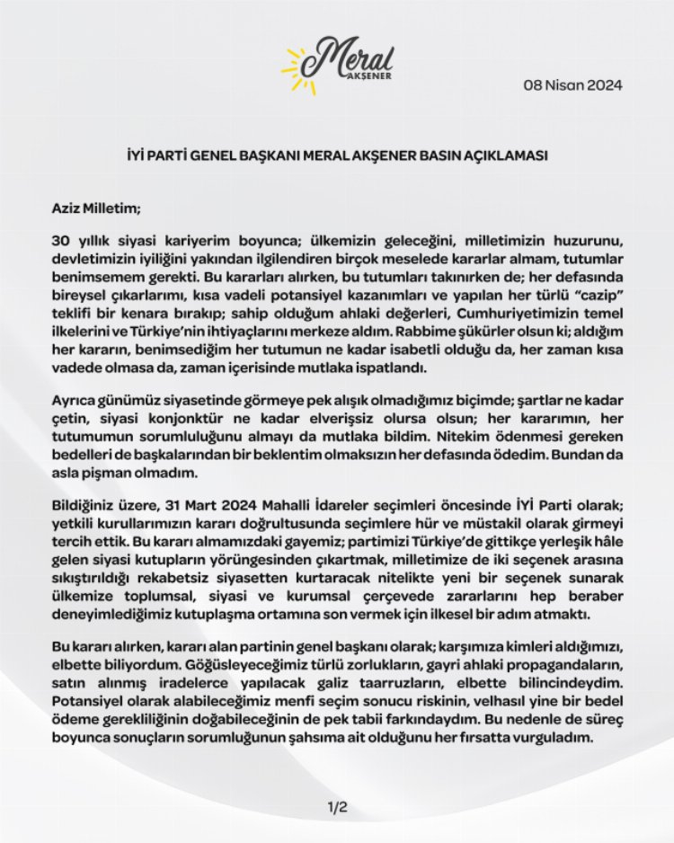 Akşener, 31 Mart 2024 Mahalli İdareler seçimleri öncesinde İYİ Parti olarak; yetkili kurulların kararı doğrultusunda seçimlere hür ve müstakil olarak girmeyi tercih ettiğinin altını çizerek, "Bu kararı almamızdaki gayemiz; partimizi Türkiye'de gittikçe yerleşik hâle gelen siyasi kutupların yörüngesinden çıkartmak, milletimize de iki seçenek arasına sıkıştırıldığı rekabetsiz siyasetten kurtaracak nitelikte yeni bir seçenek sunarak ülkemize toplumsal, siyasi ve kurumsal çerçevede zararlarını hep beraber deneyimlediğimiz kutuplaşma ortamına son vermek için ilkesel bir adım atmaktı.