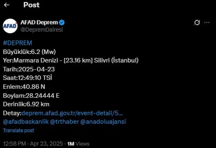 Kandilli Rasathanesi ve Deprem Araştırma Enstitüsü, Marmara Denizi Silivri açıklarında 4.0 büyüklüğünde deprem meydana geldiğini bildirdi. Kısa süreli panik yaratan deprem Yalova, Bursa, İstanbul ve diğer çevre illerde de hissedildi. 12: 13’te yaşanan depremin derinliği 6.99 kilometre olarak ölçüldü.