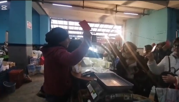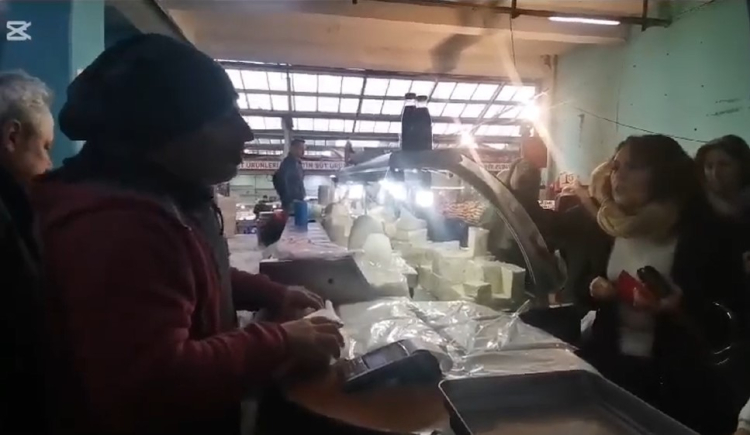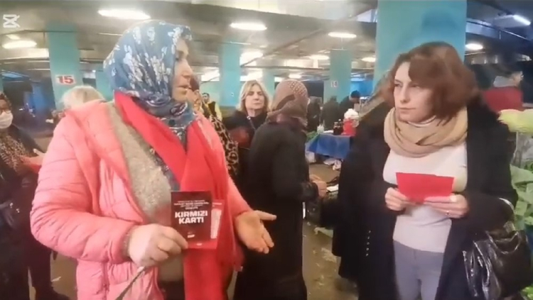 Pazar esnafıyla görüşen Meyrem Ataç, esnafa ve vatandaşa kırmızı kart dağıttı. Hükümeti pahalılıktan dolayı eleştiren Ataç, iktidara kırmızı kart gösterdi. Vatandaşlar da ellerine aldıkları kırmızı kartı göstererek pahalılığa tepki gösterdi.