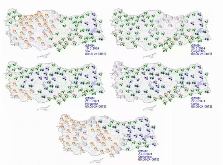 Meteoroloji Genel Müdürlüğü hafta başında yeni hava tahmin raporunu yayınladı. Yapılan tahminlere göre bugün ve yarın 10 kent için sağanak ve kar uyarısı verildi. Çarşamba günü ise tüm yurt için uyarı geldi. Birçok kentte hafta boyunca kar yağışı devam edecek ve bazı illerde de kar yağışı ve sağanak yağış birlikte görülecek.